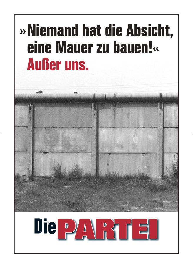 Niemand hat die Absicht, eine Mauer zu bauen. - Außer uns! Und das heißt: Außer der PARTEI, die das Motto von TITANIC umsetzen will: Die endgültige Teilung Deutschlands. Denn das ist unsere Aufgabe. Und mit diesem Plakat wird sie zum Kinderspiel!